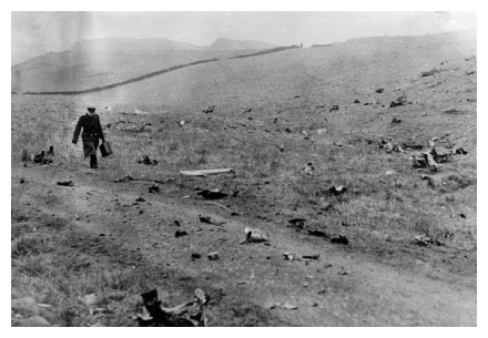 Off we went on our bicycles to have a look. Sure enough, on a hillside, there was the remains of what had been an aircraft. I remember seeing the pieces of uniform and a body before the RAP men chased us away. One of the German crew had ginger hair which took me by surprise thinking Germans did not have hair this colour.